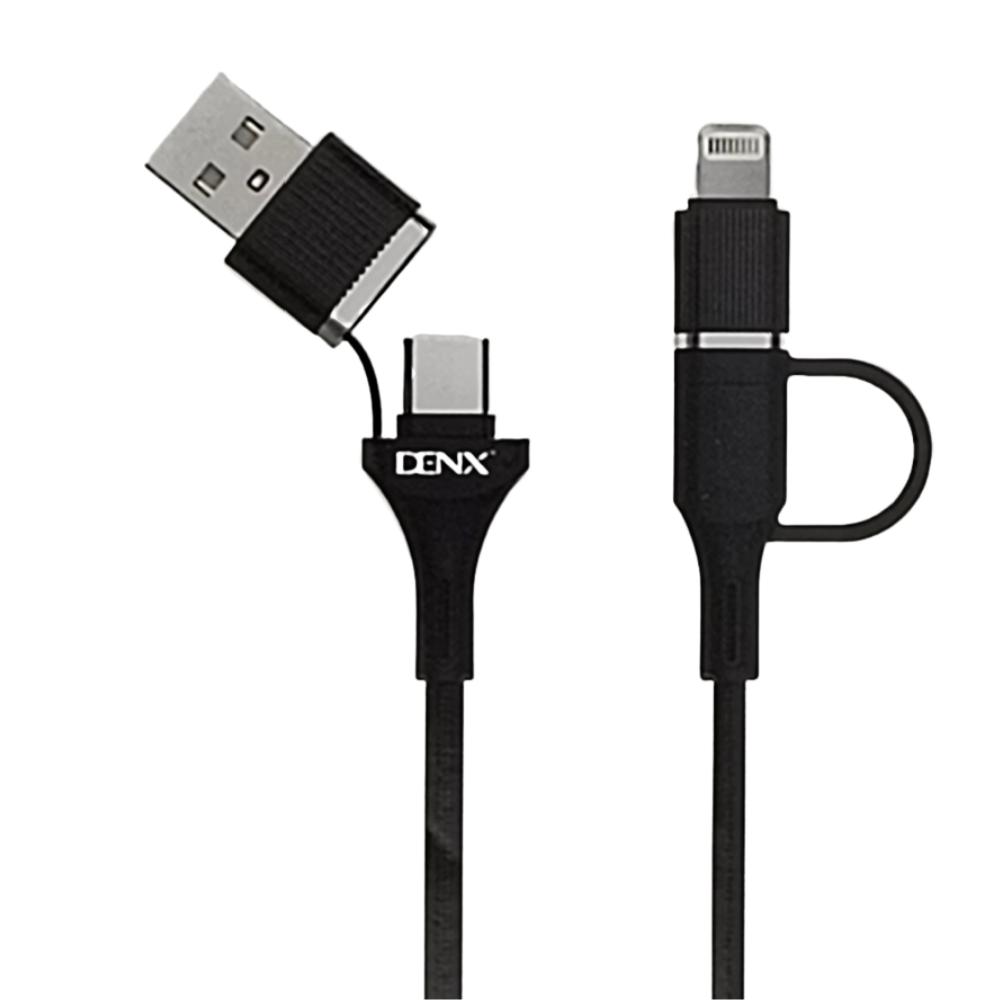 كابل متعدد الاستخدامات من DENX بتصميم عملي 4 في 1، يجمع بين منفذ Lightning وType-C وUSB في كابل واحد بطول 1 متر. يتميز بخامة متينة من النايلون المجدول مع هيكل من الألمنيوم لمقاومة الانحناء والتلف، ويدعم الشحن السريع ونقل البيانات بكفاءة عالية لجميع أجهزتك.