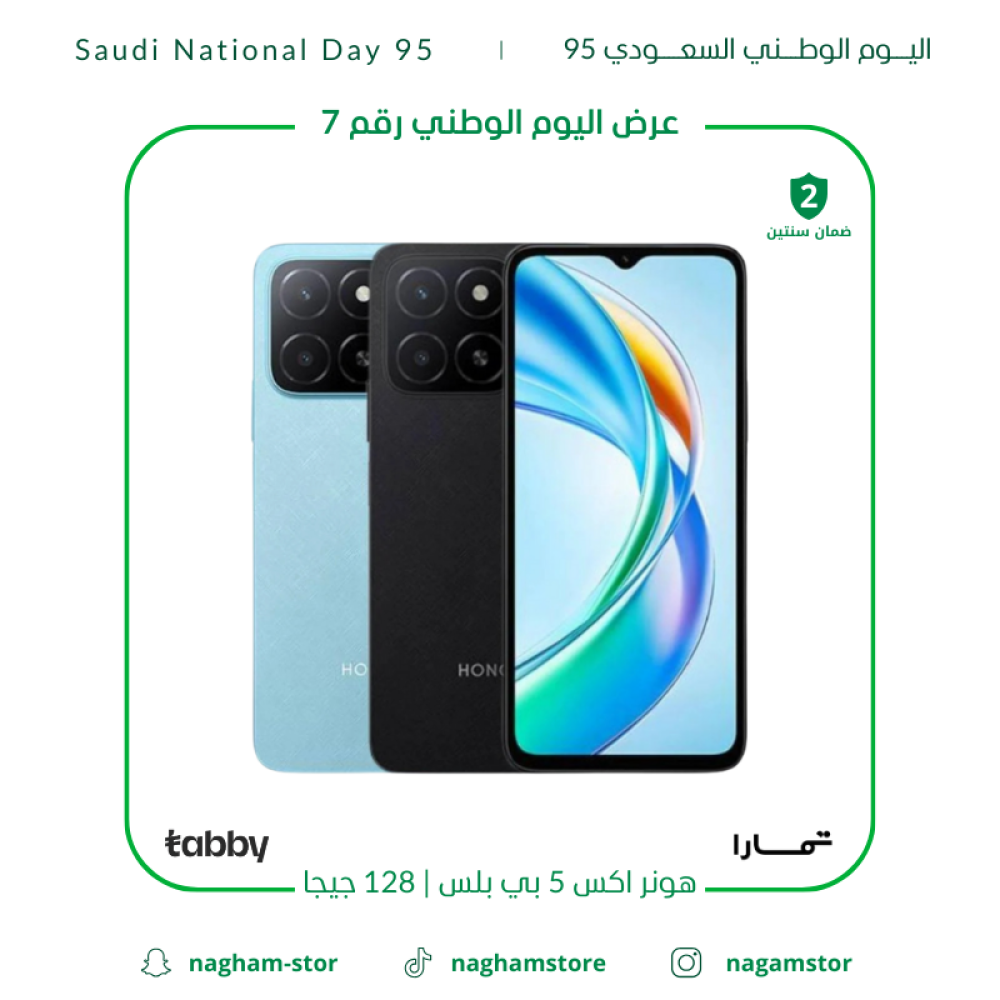 استمتع باستخدام مريح مع هونر اكس 5 بي بلس بسعة 128 جيجا، لتحتفظ بملفاتك وتطبيقاتك بسهولة. تصميم عصري وأداء عملي يلبي احتياجاتك اليومية. متوفر الآن ضمن تخفيضات اليوم الوطني