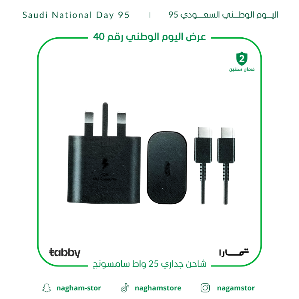 اشحن أجهزتك بسرعة وموثوقية مع شاحن جداري 25 واط سامسونج. يجمع بين شاحن جداري 25 واط + كيبل سامسونج اصلي من سامسونج ليمنحك مرونة أكبر في شحن أجهزتك أينما كنت. متاح الآن بمناسبة اليوم الوطني